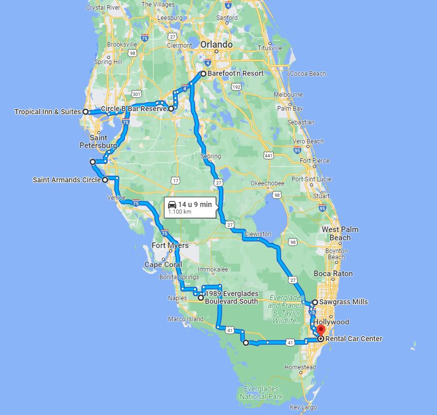 Vanmorgen hebben het laatste stukje storm uitgezeten. Dit zou een dag zijn waarop de storm op zijn sterkst boven Orlando/Kissimmee zou zijn., maar het viel uiteindelijk wel mee. Aan het einde van de ochtend werd het al snel rustiger en tegen twee uur waren we het binnen zitten zat en zijn we er nog even op uit getrokken. We zijn naar de “The Loop” gereden, waar nog wel wat leuke winkels zaten voor wat laatste inkopen. Details zal ik jullie besparen. Uiteindelijk zijn we terechtgekomen bij een Outback Steakhouse en hebben we lekker gegeten. Bijzonder vriendelijke bediening, maar we zijn in betere vestigingen geweest van deze keten, het eten was matig. Toen ik net een stuk van mijn reisverslag terug keek, leek het de laatste twee dagen wel een groot weerbericht. Deze storm heeft toch twee volle dagen van onze Floridareis in beslag genomen. Van kajakken in Ocala Forrest of nog een dagje strand bij Cocoa Beach is niets terechtgekomen. Maar je ontkwam er gewoon niet aan, de storm was er we hadden er mee te dealen en ik ga het er maar niet meer over hebben. Inmiddels hebben we de tassen al weer grotendeels ingepakt, want morgenochtend verlaten we dit fijne appartement en rijden we naar Miami. We rijden op ons gemak via HW27, het is Veteransday misschien komen we nog wat leuks tegen, via Sebring en Clewiston naar het zuiden met een grote stop in de Sawgrass Mill Mall bij Ft. Lauderdale. Totale afstand 382km, van Sawgrass Mill naar het rentalcenter is 47km door een druk Miami. Om 20.00uur moeten we de auto inleveren, dat moet dus geen probleem zijn.