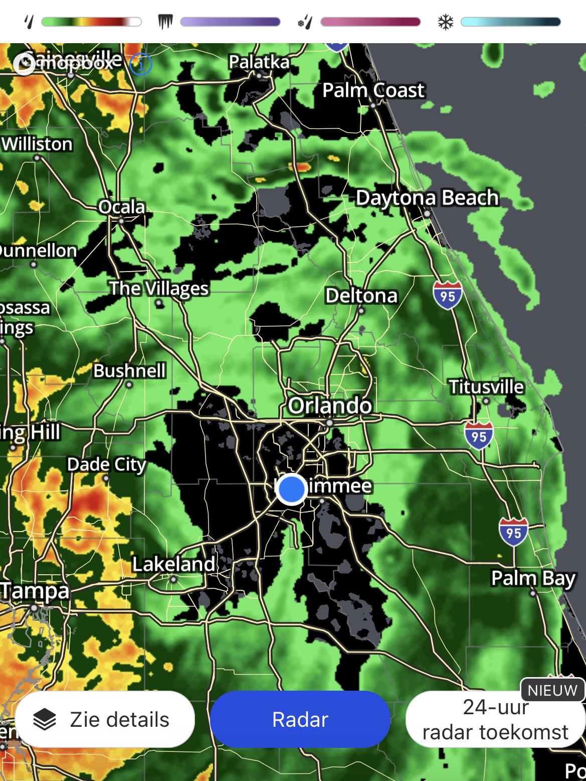 We zijn er aan het eind van de middag nog op uitgetrokken, maar niet naar de Florida Mall. De dichterbij gelegen Lake Buena Vista Factory Stores. vonden we verstandiger. Hoewel dit een “buiten Mall” is, hebben we het onder al die zonneschermen best wel drooggehouden. Het was er heerlijk rustig, dus we hebben alle tijd genomen voor de winkels en bij de World of Coffee even gezeten met een lekkere Coffee-Mocha. Na deze Mall nog even wat boodschappen gedaan bij de Walmart, waar om kwart voor drie ineens werd omgeroepen dat ze om half vier gingen sluiten. Het was grappig om te zien hoe mensen in de Walmart op dit bericht reageerden. Het bericht had ook wel wat duidelijker/rustiger maar vooral completer kunnen worden gebracht. Je zag mensen verschrikt opkijken en versneld hun boodschappen gaan doen. Ik verwachtte eigenlijk wel behoorlijke rijen bij de kassa’s, maar daar had Walmart goed op ingespeeld. Gegeten hebben we in ons appartement en later heb ik op aanraden van AA forumlid Disney-Golf (Thanks!) de auto nog even afgetankt. Mocht er stroomuitval komen kan je immers ook niet tanken, had ik even niet aan gedacht. Verder was het een rustige avond met af- en toe een fikse bui, maar weinig tot geen wind. Vannacht was het anders en trok Nicole verder over centraal Florida. Ik ben een keer van de wind en regen wakker geworden, toen ging het behoorlijk tekeer. Vanmorgen (08.00uur) toen ik wakker werd, was het droog en stond er bijna geen wind. Mogelijk zat Kissimmee een beetje in het midden van de storm en gaat het zo nog even verder. Ik schreef het al eerder, aan de oostkust (Melbourne, Flagner Beach maar ook Daytona Beach filmpje zie ik) zijn ze echt de klos. Het strand zie je niet en de zee spoelt constant tegen het duin aan, wat niet overal aanwezig is. Alles kalft dan door de aanhoudende reeks golven snel af. Volgens de nieuwszenders zal het na het middaguur snel beter (filmpje) worden, dan is de storm een stuk noordelijker getrokken. Vanmiddag maar eens zien wat we nog kunnen doen en of we vanavond nog lekker ergens kunnen eten. Plaatje hieronder is van 09.15uur. Al dat groen/gele spul draait tegen de klok in.